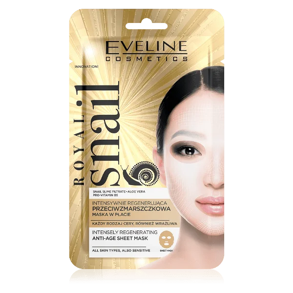 Intensely Regenerating ANTI-AGE Sheet Mask, thanks to the content of carefully selected active ingredients: snail slime filtrate, aloe vera, pro-vitamin B5, betaine, chamomile and cucumber extracts, smoothes and reduces wrinkles, improves skin firmness, intensely moisturises and nourishes the skin.